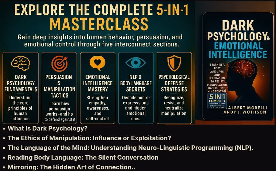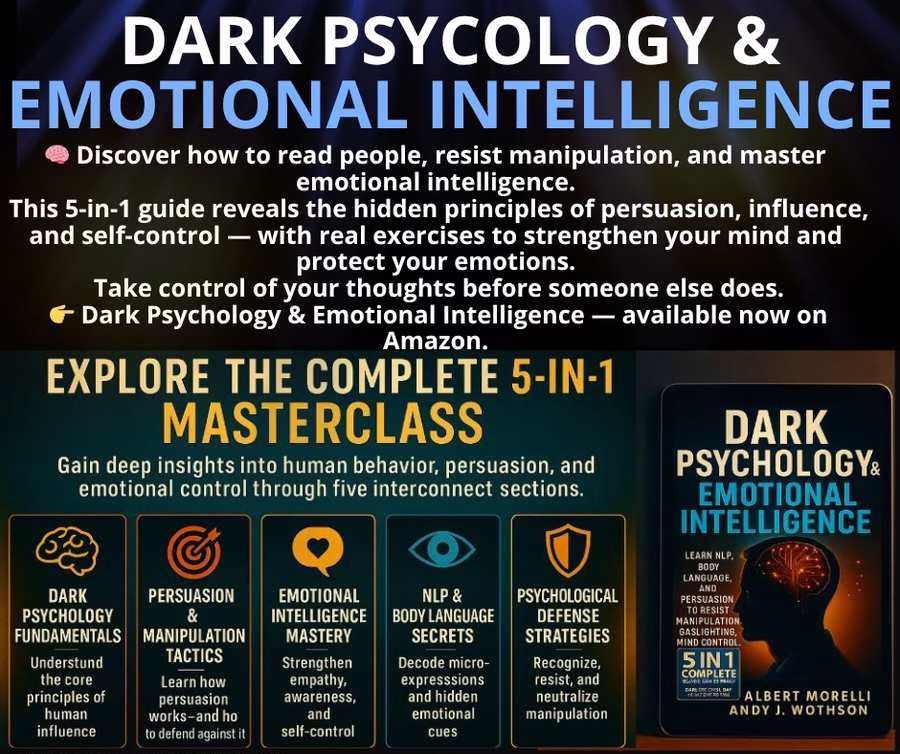 In Dark Psychology & Emotional Intelligence: 5-in-1 Complete Masterclass, authors Albert Morelli and Andy J. Wathson guide readers through one of the most fascinating journeys of modern self-discovery—the ability to understand, protect, and influence the human mind. This is a practical roadmap for recognizing manipulation, decoding behavior, and strengthening emotional intelligence.